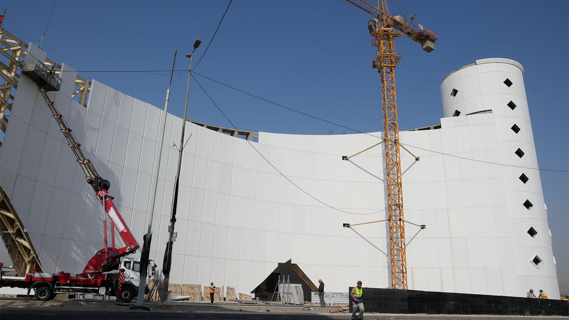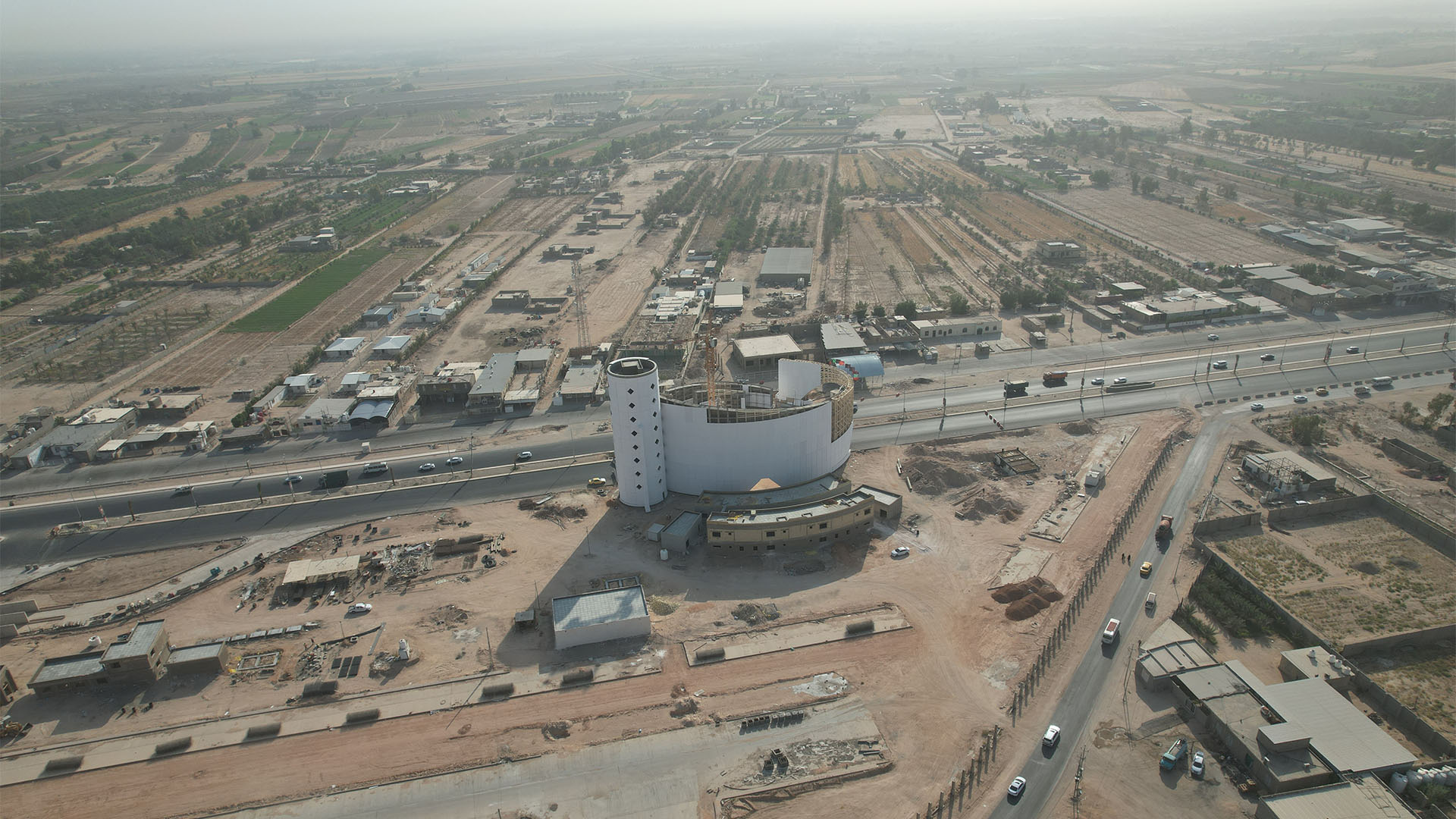 The project features a massive central cylinder, built from reinforced concrete, connected to a wide curved structure that extends across the two main roads leading into the city. This elevated curve is supported by a combination of steel structure and reinforced concrete, forming a continuous architectural frame that defines the gateway to the holy cities.
