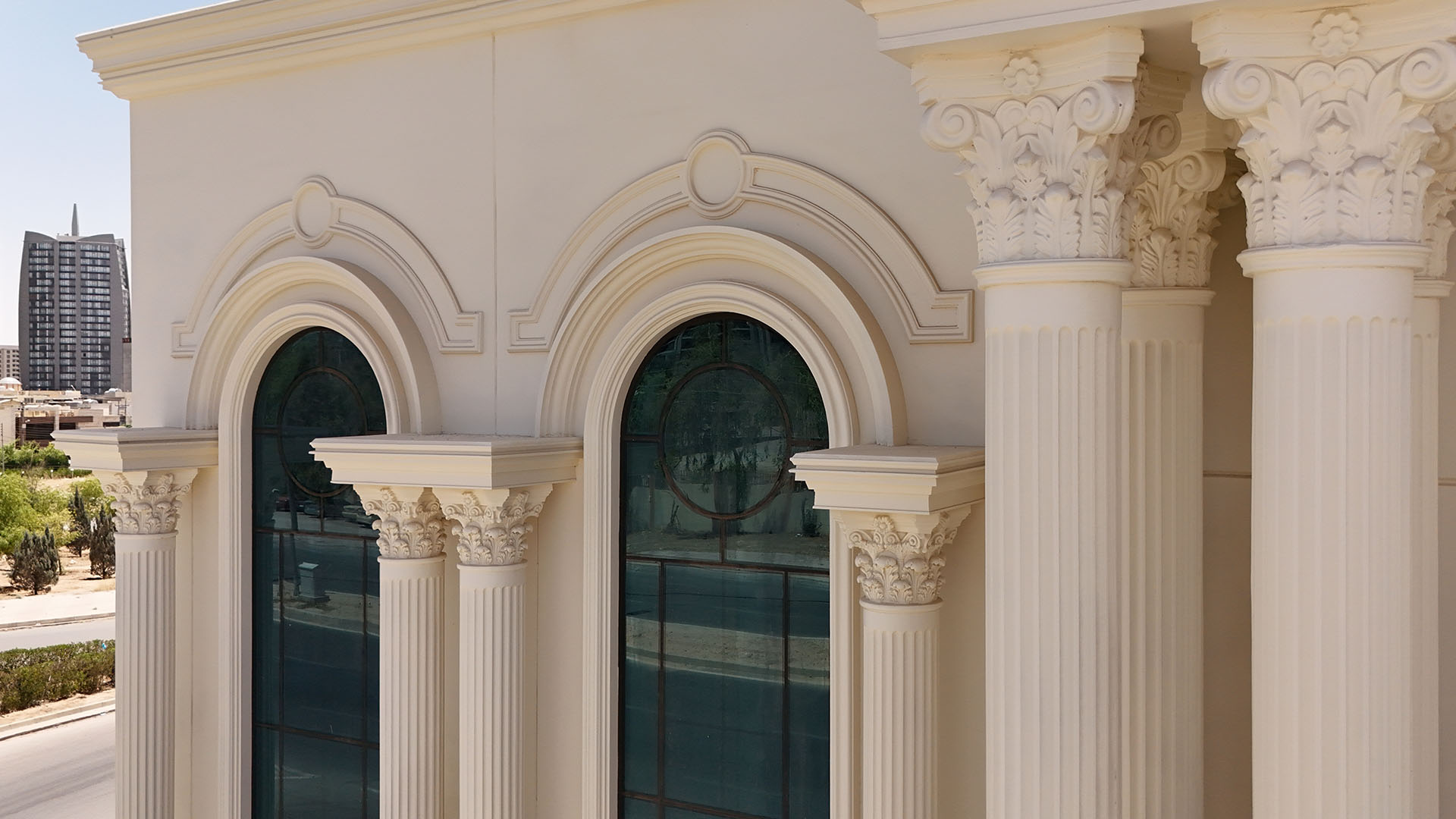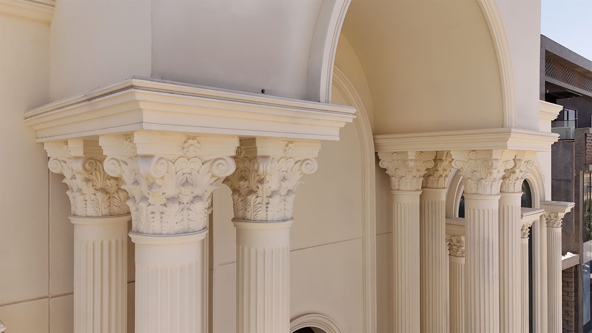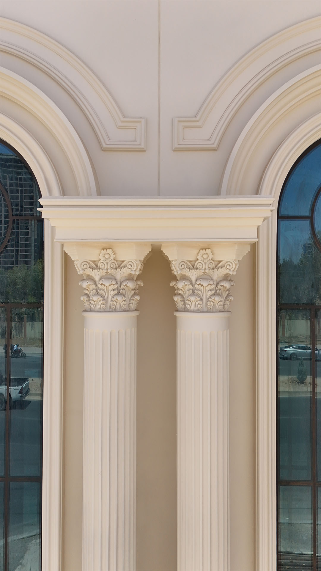 The façade includes tall classical GFRC columns with no horizontal joints, supported by high-detail crown capitals that showcase our precision in artistic GFRC work. With our specialized production system and high-precision molds, Nubin can manufacture any architectural or artistic detail, from simple modern lines to complex decorative forms.