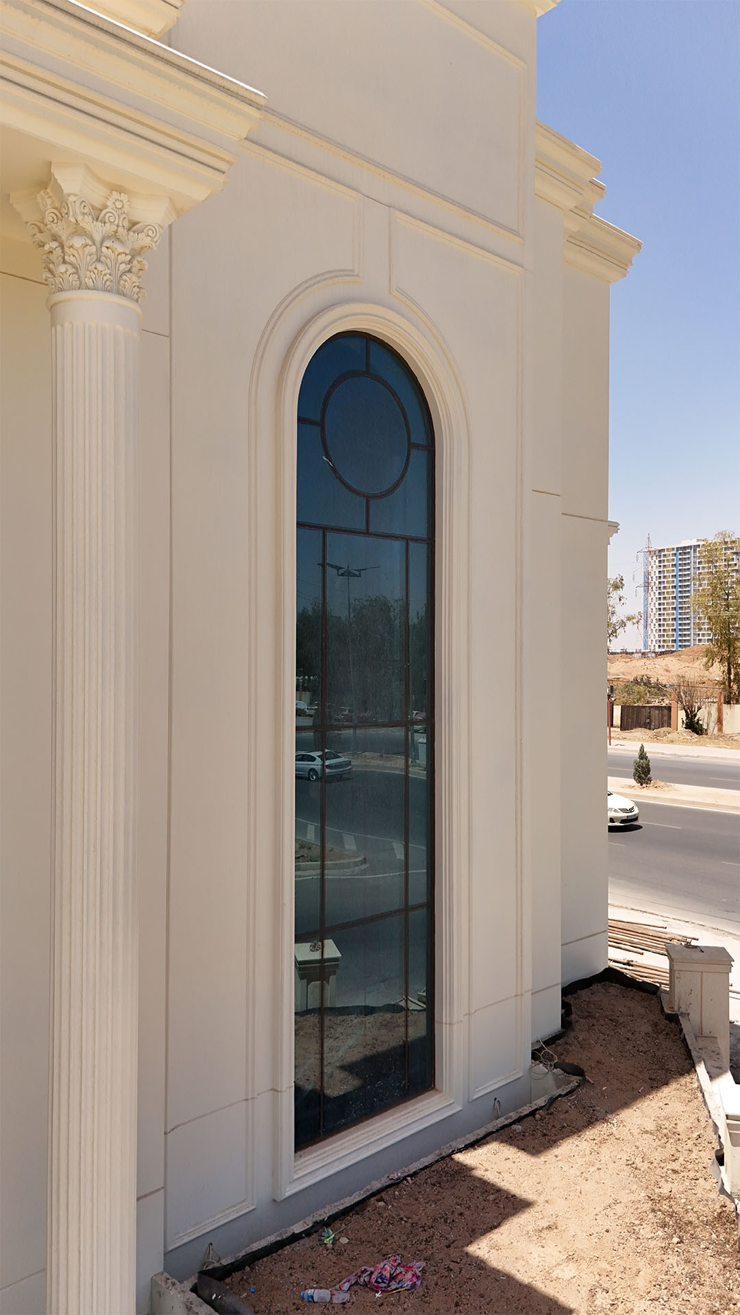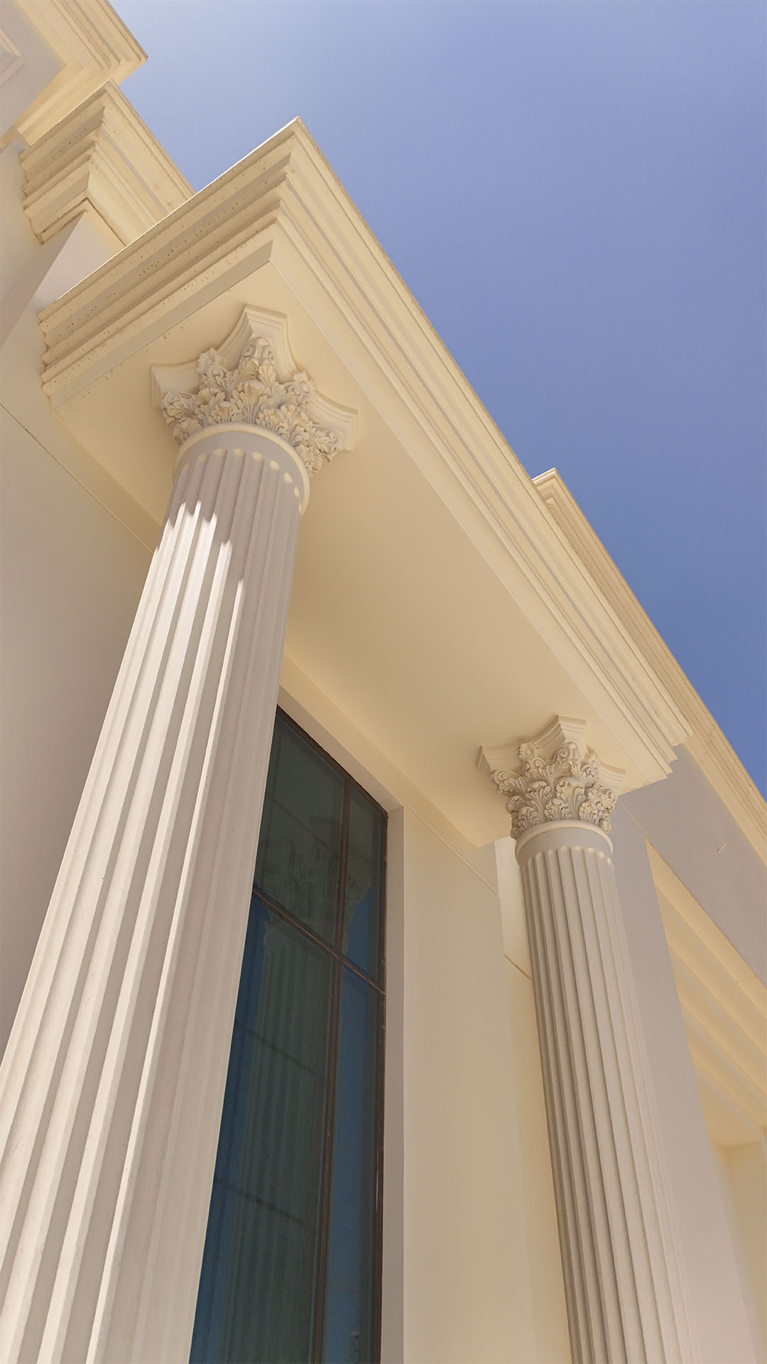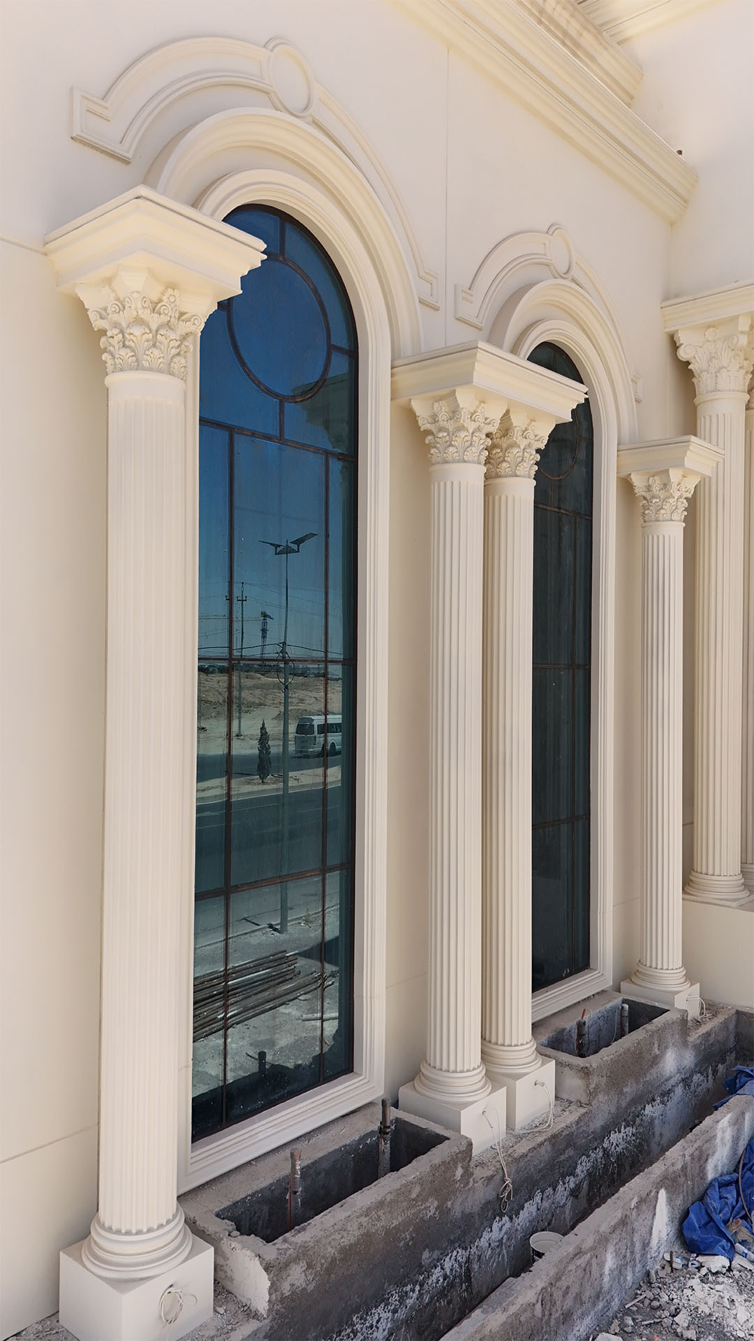 The façade includes tall classical GFRC columns with no horizontal joints, supported by high-detail crown capitals that showcase our precision in artistic GFRC work. With our specialized production system and high-precision molds, Nubin can manufacture any architectural or artistic detail, from simple modern lines to complex decorative forms.