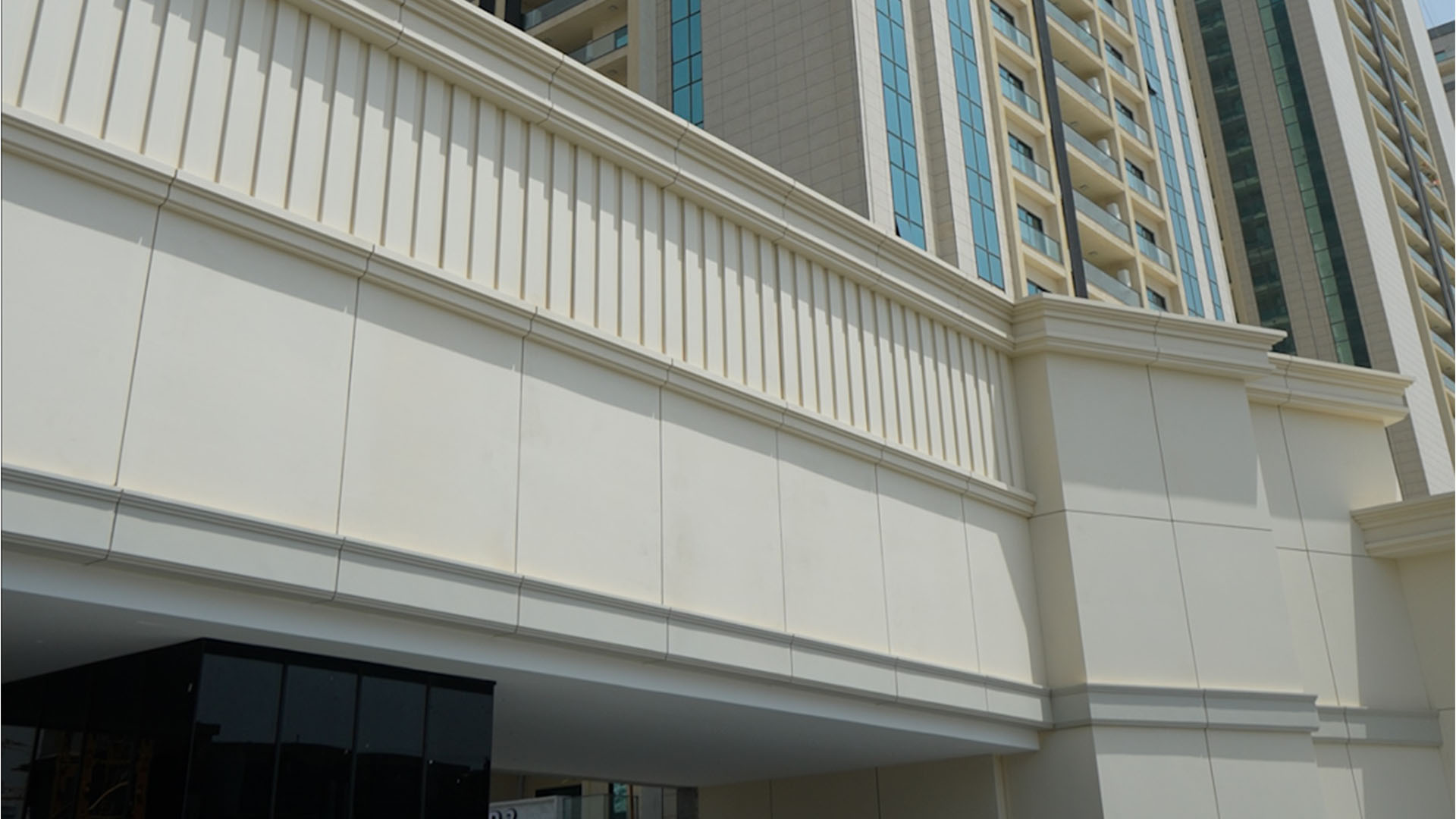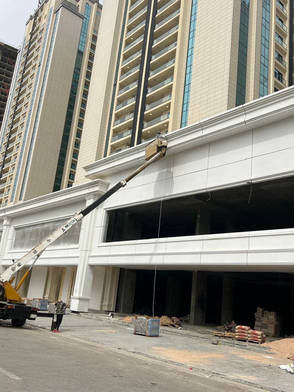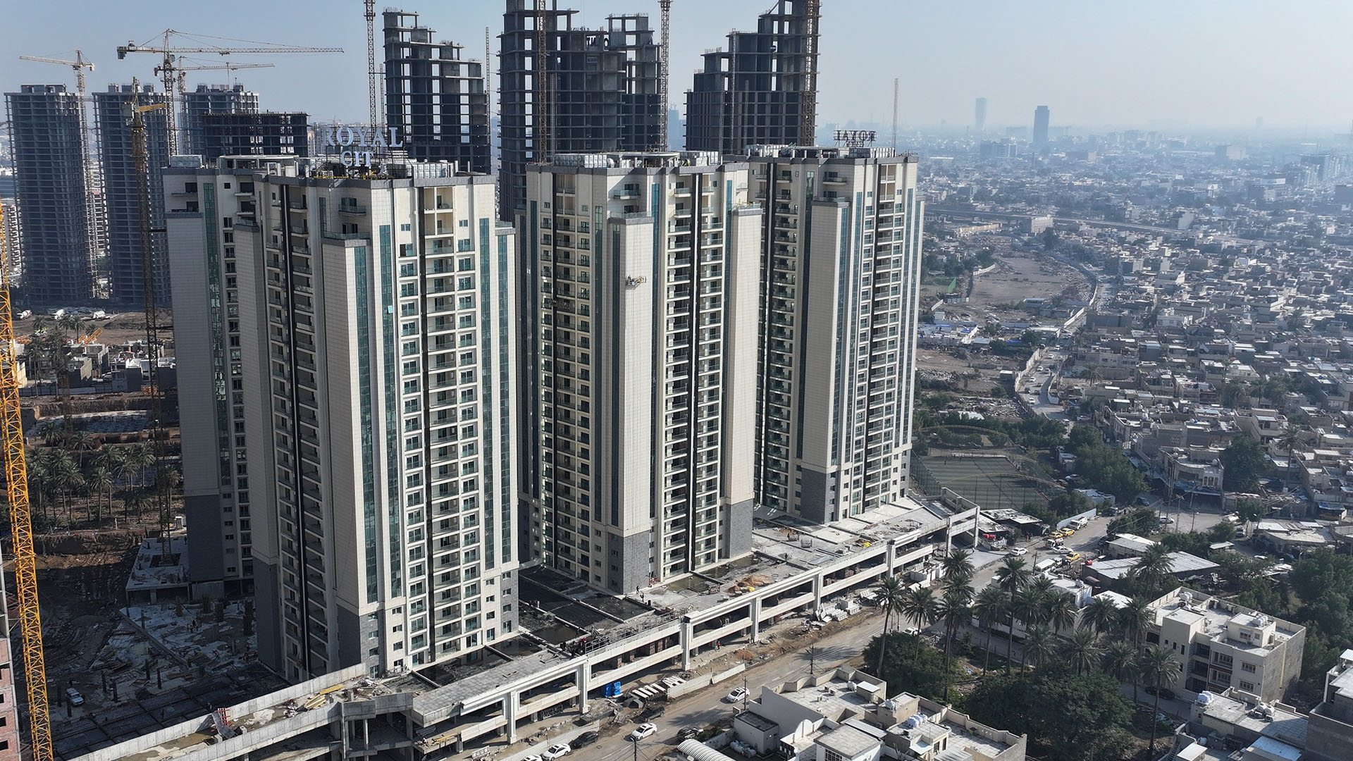 Nubin Factory completed the full GRC cladding of the Royal City residential towers, one of Baghdad’s most prominent developments. The project features two grand main gates and a continuous commercial façade that wraps more than 400 meters around the towers.