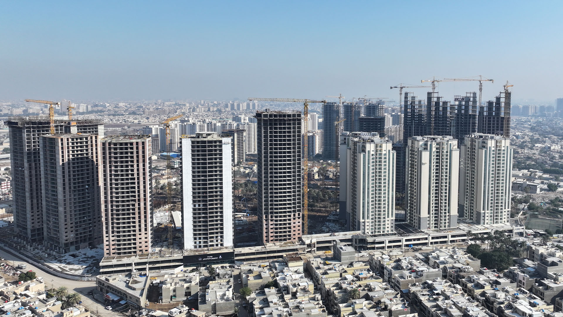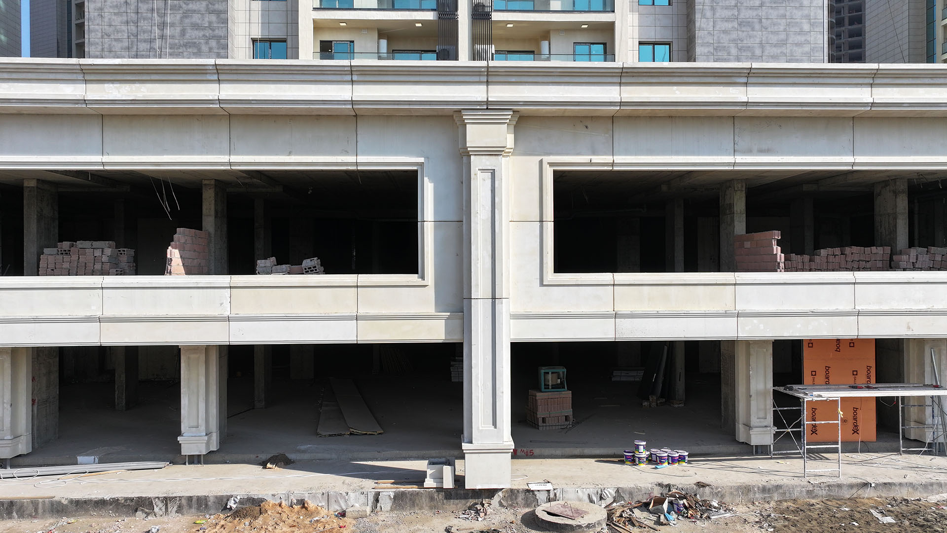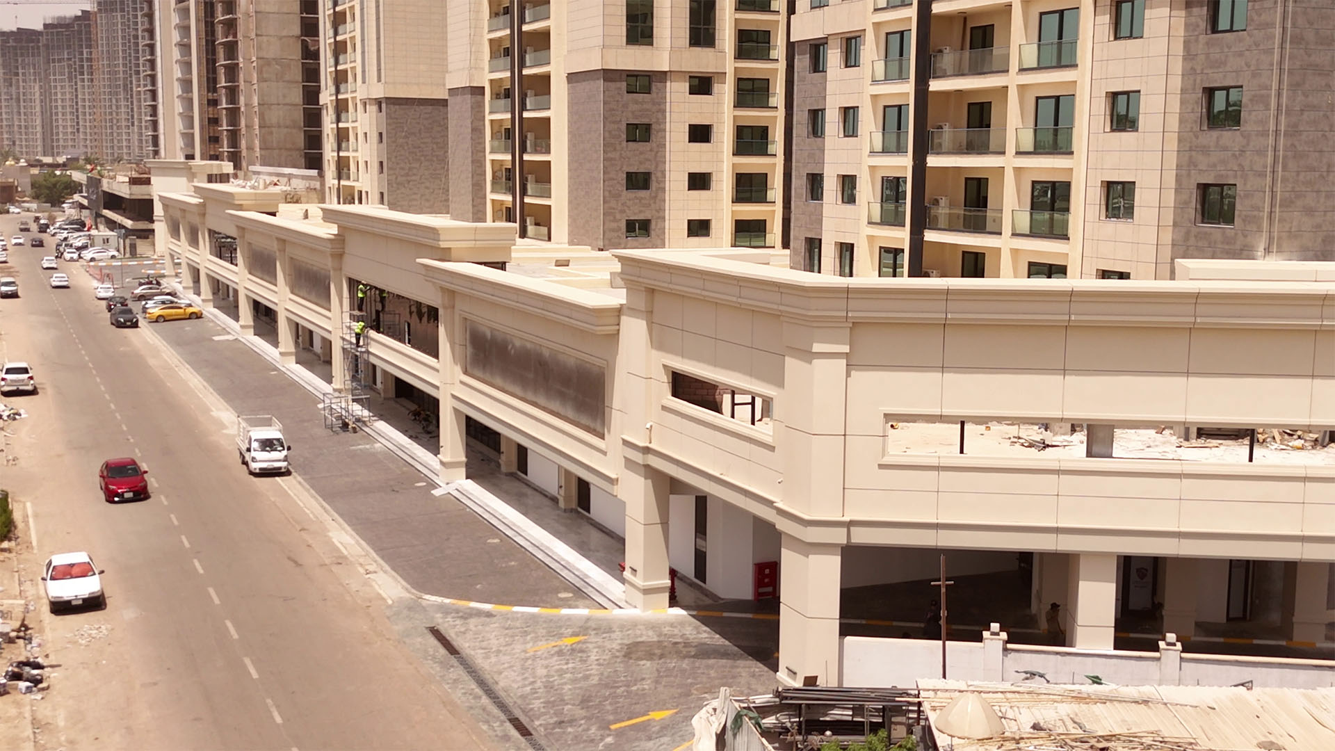 Nubin Factory completed the full GRC cladding of the Royal City residential towers, one of Baghdad’s most prominent developments. The project features two grand main gates and a continuous commercial façade that wraps more than 400 meters around the towers.