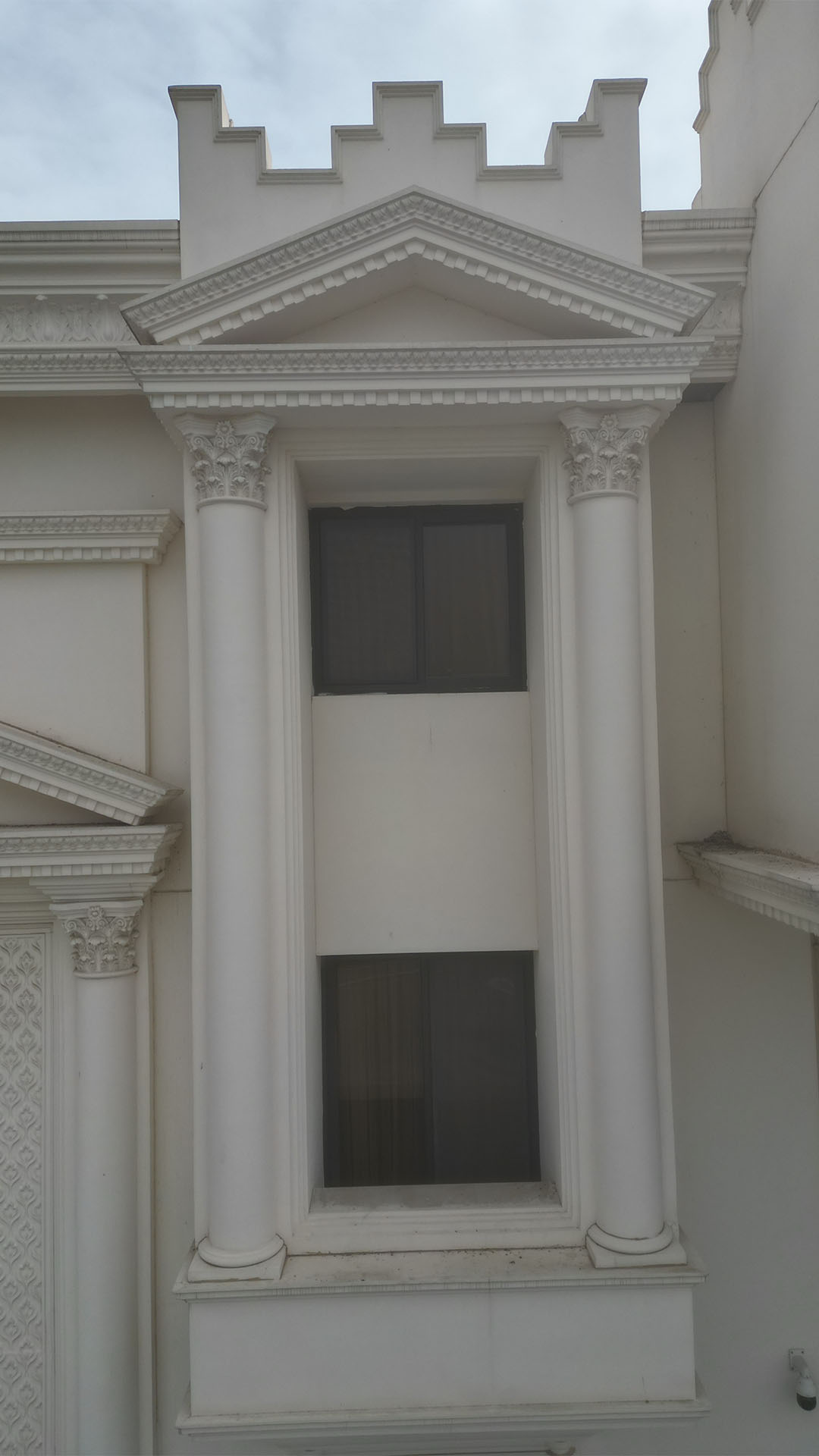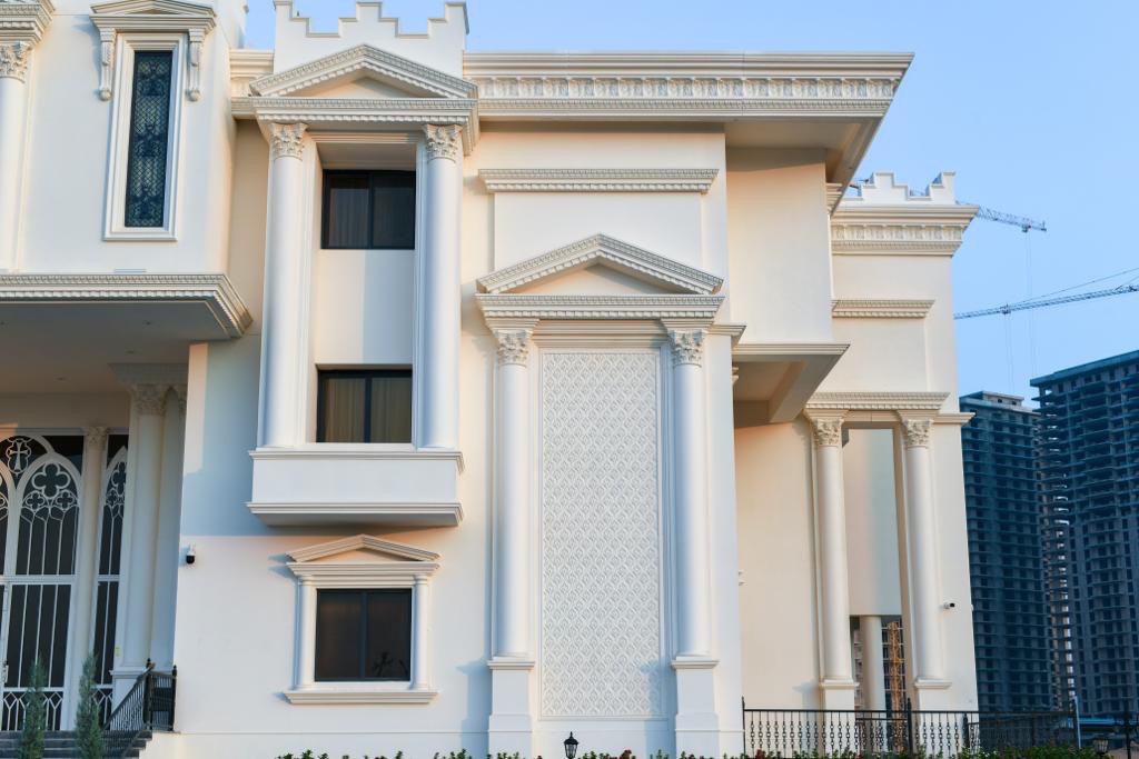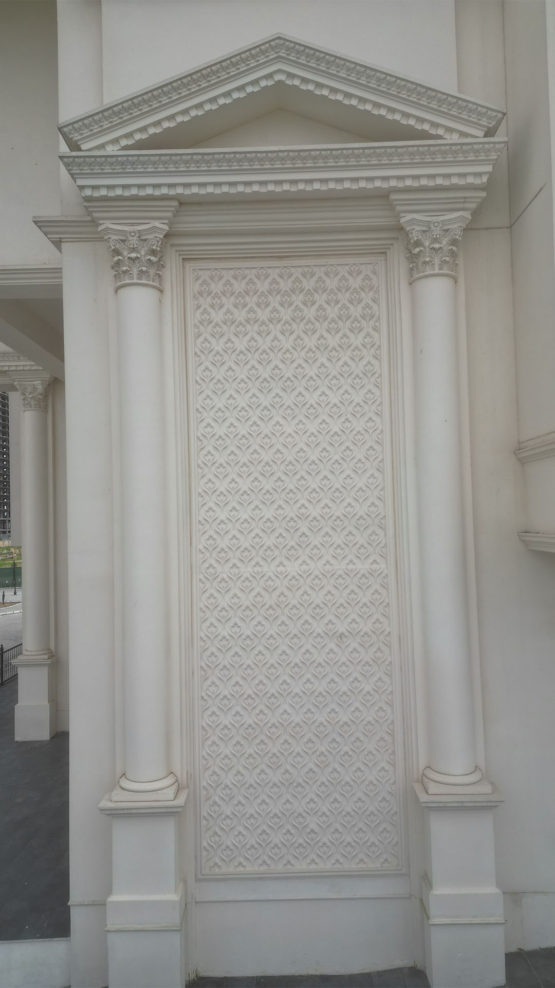The façade showcases a rich classical style, featuring large GRC CORNICES, hand-crafted GRC CROWN, detailed patterns, and one-piece GRC columns and window frames. These elements were produced using Nubin’s advanced mold-making techniques, ensuring high-definition details and long-lasting performance.
