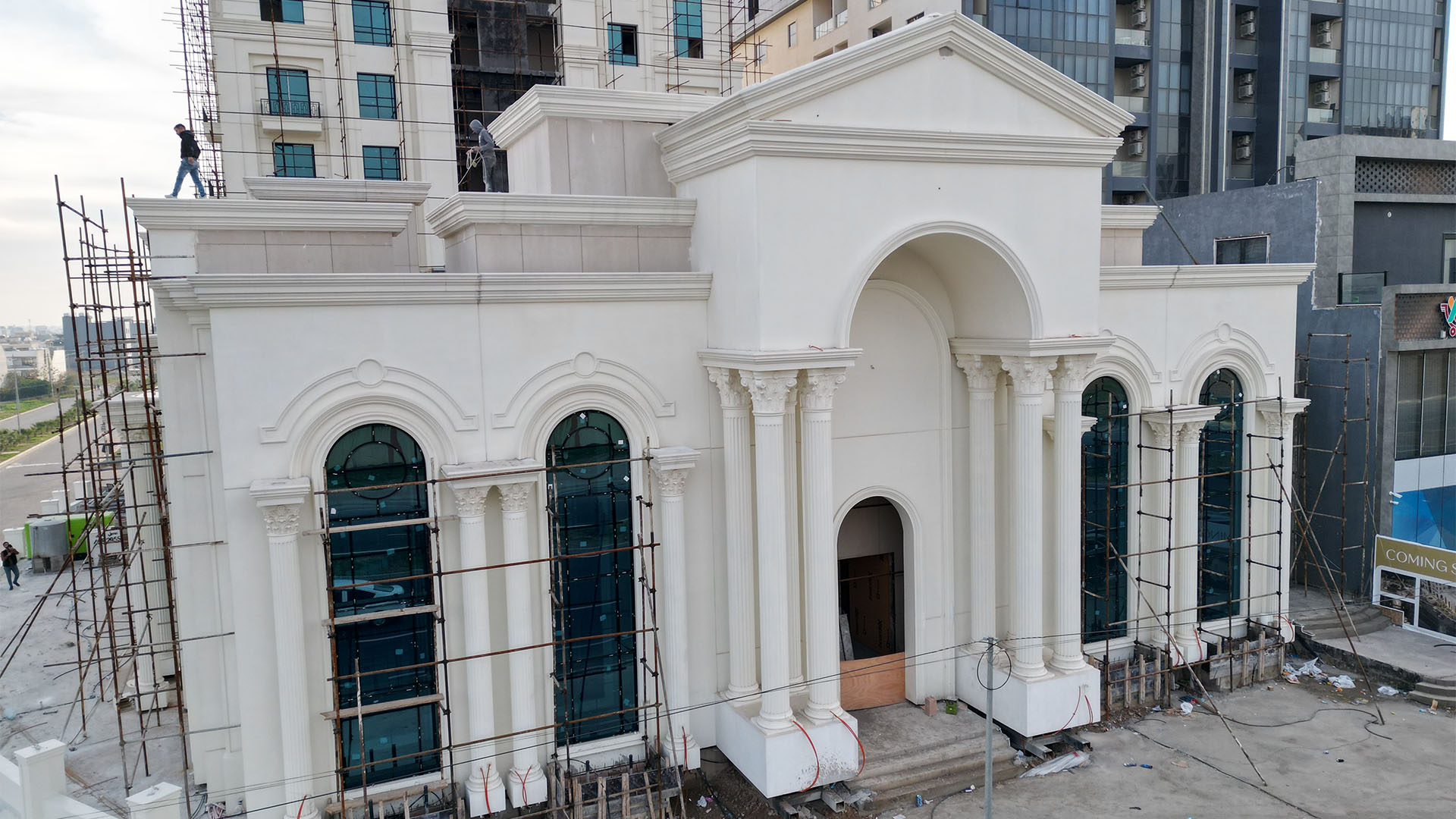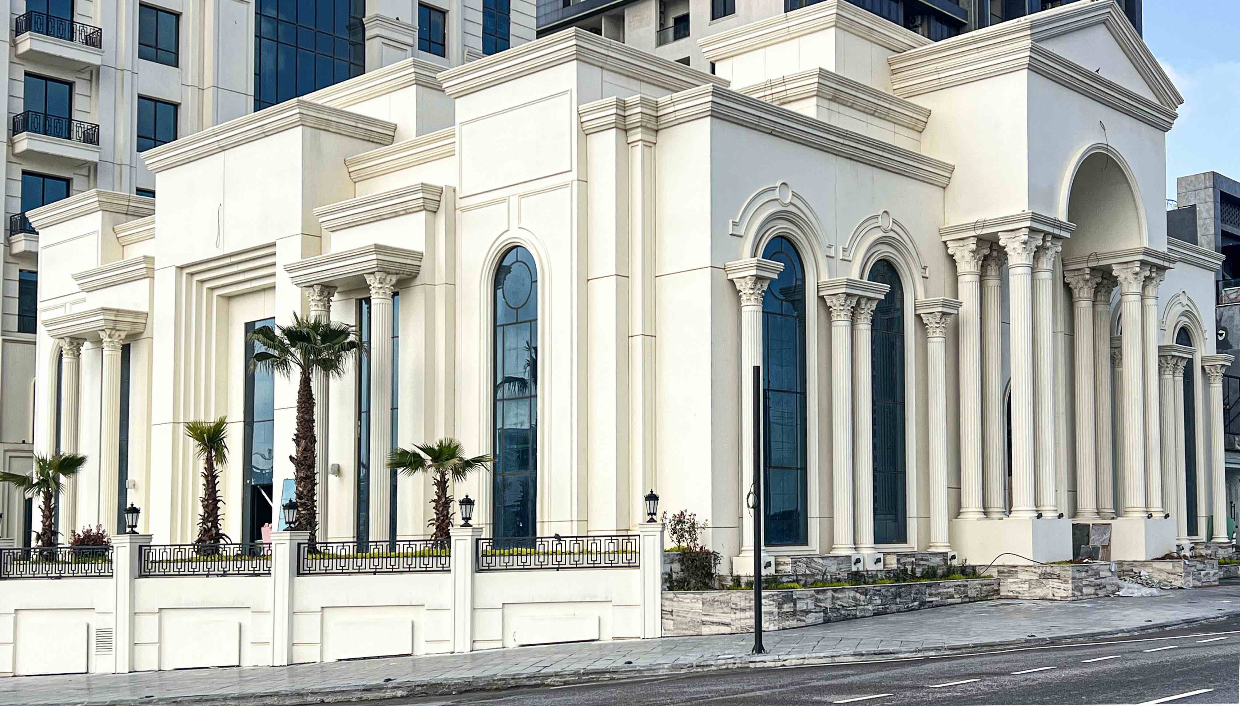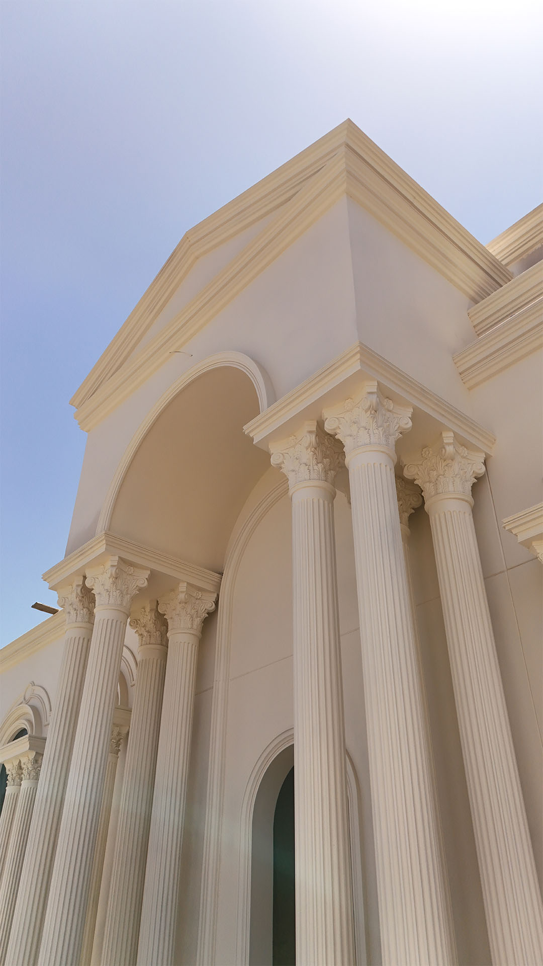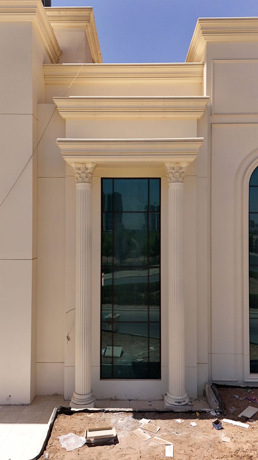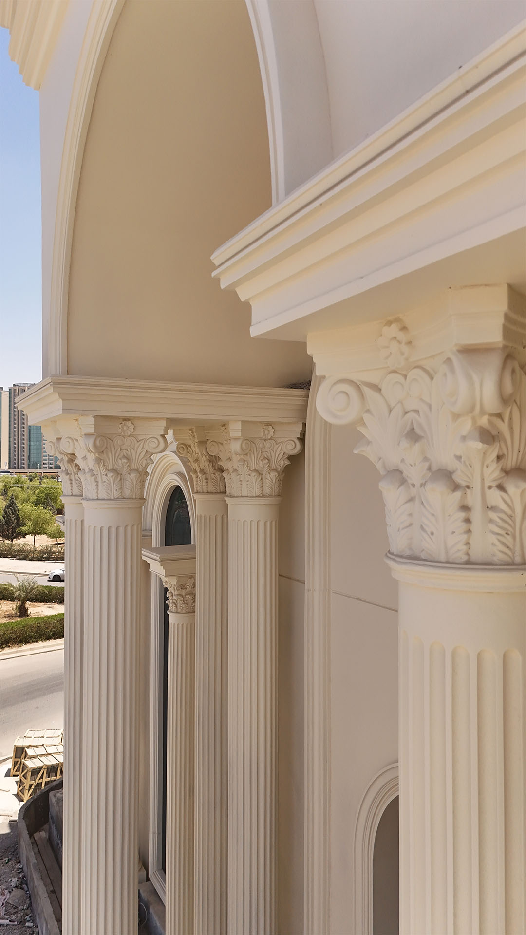 The façade includes tall classical GFRC columns with no horizontal joints, supported by high-detail crown capitals that showcase our precision in artistic GFRC work. With our specialized production system and high-precision molds, Nubin can manufacture any architectural or artistic detail, from simple modern lines to complex decorative forms.