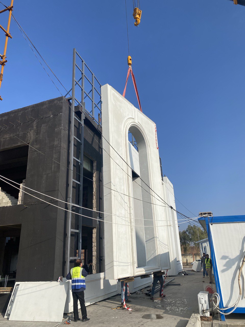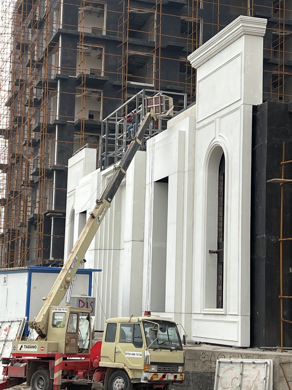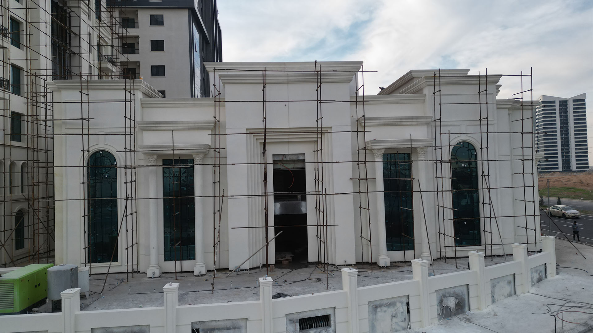 This restaurant building features a mixed architectural style enhanced by premium GFRC elements manufactured by Nubin Factory. The façade includes exceptionally large one-piece window units—each 4.5 m wide × 9 m high and weighing 1.8 tons—designed and cast using our advanced mold-making technology to ensure perfect alignment and high durability.